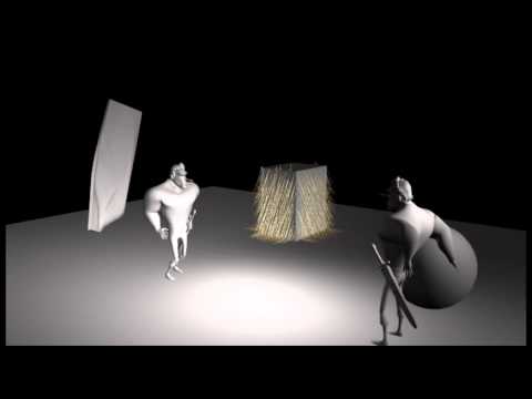 Voici le résultat final qui combine le mocap (à droite) et l'animation en keyframe (à gauche). En arrière plan, on peu voir un cube poilu qui réagit au sol (à la base, le ballon devait être poilu mais la scène devenait trop confuse) ainsi qu'un lourd ncloth semblable à un tapis d'entrainement.